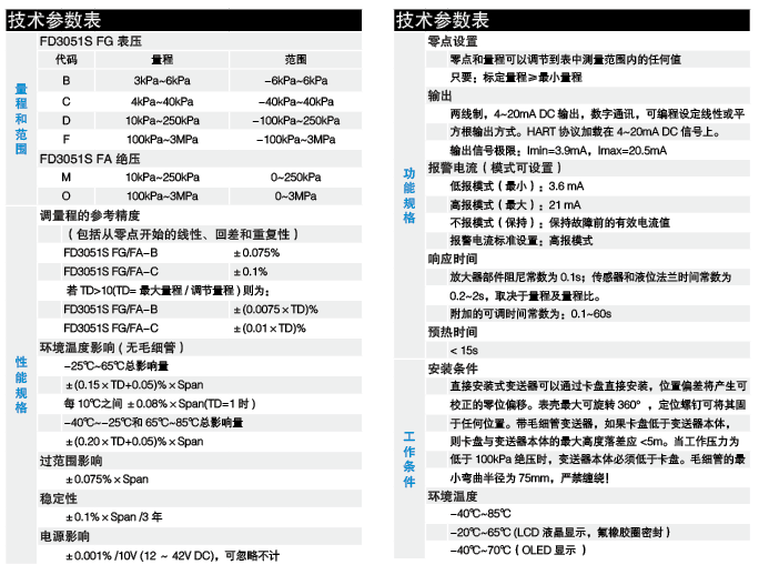 FD3051S FG/FA卫生型表压/绝压变送器用于测量液体、气体或蒸汽的液位、密度、压力,然后将其转变成4~20mADC HART电流信号输出。FD3051S FG/FA也可与FDT375手持终端或FDM100 Modem 相互通讯,通过它们进行参数设定、过程监控等。