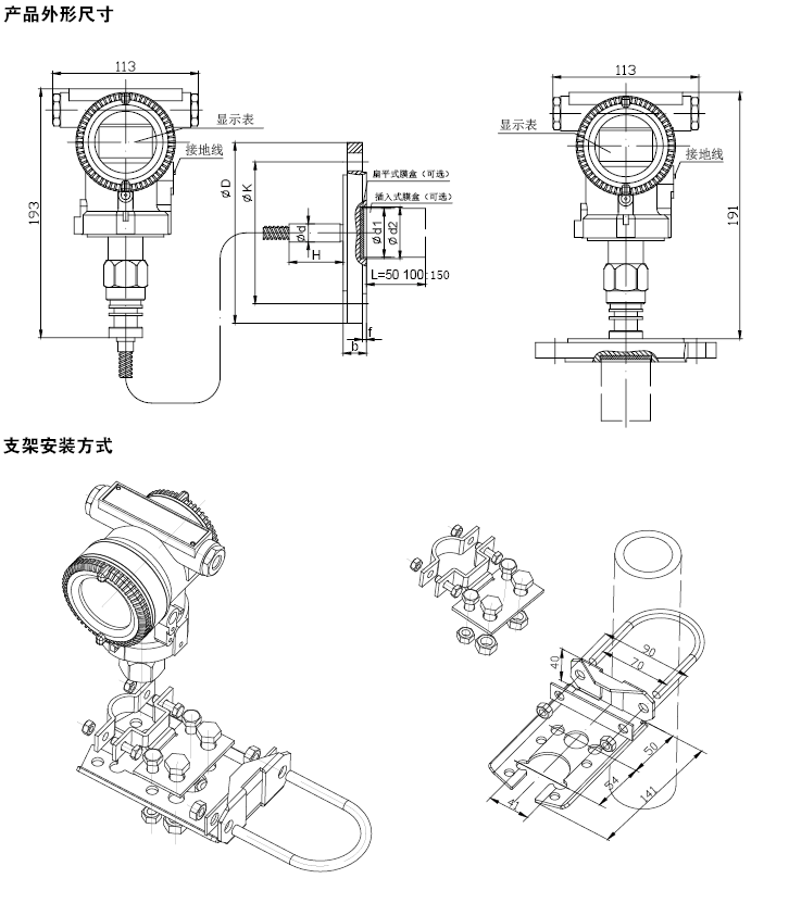 FD3051S LA/LG绝压/表压远传变送器在结构上,由FD3051STG/TA系列压力/绝压变送器和经焊接安装的带毛细管远传法兰组成。作用在远传法兰侧的压力,首先经远传法兰上的膜片和填充液,再经毛细管,最后到达测量传感器的测量端。