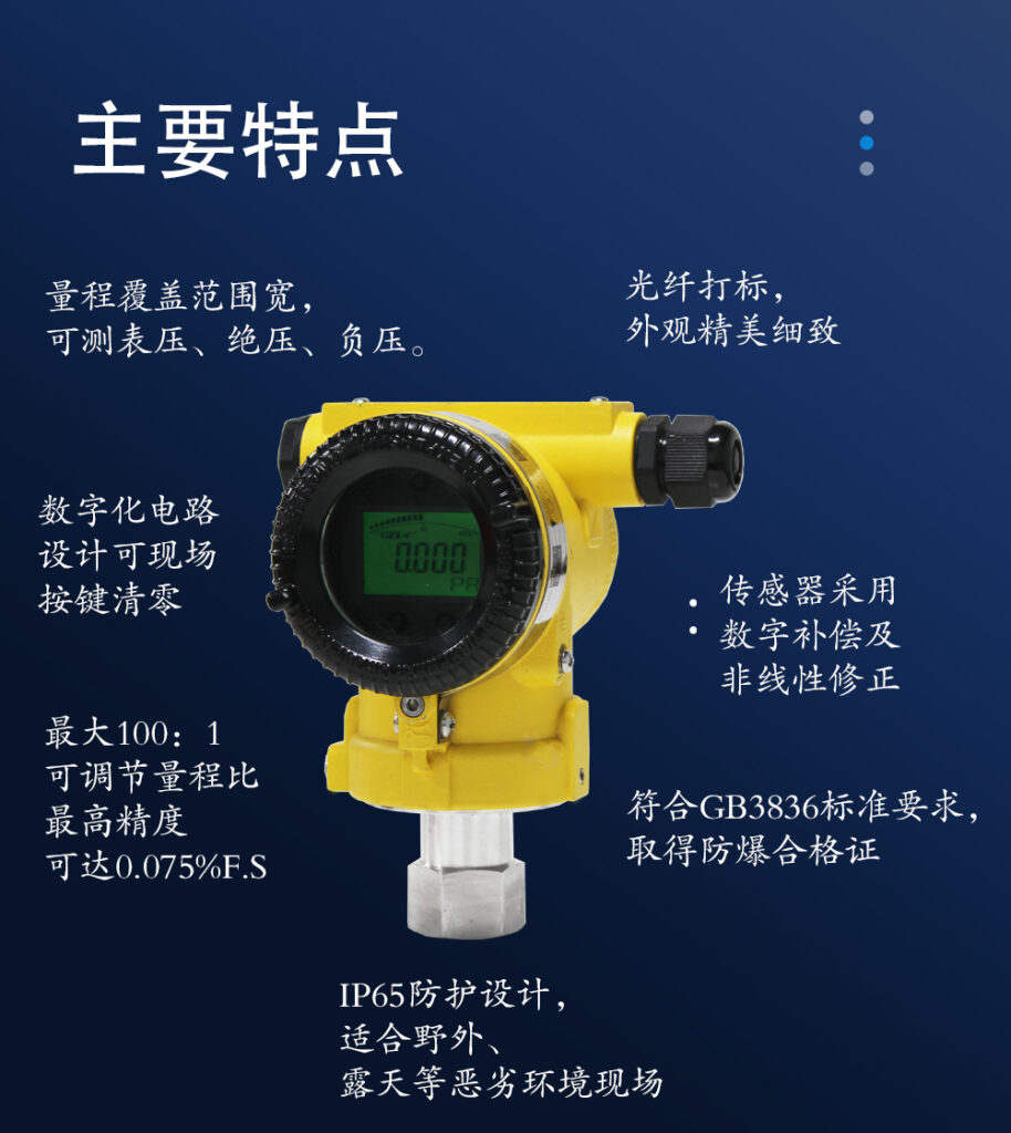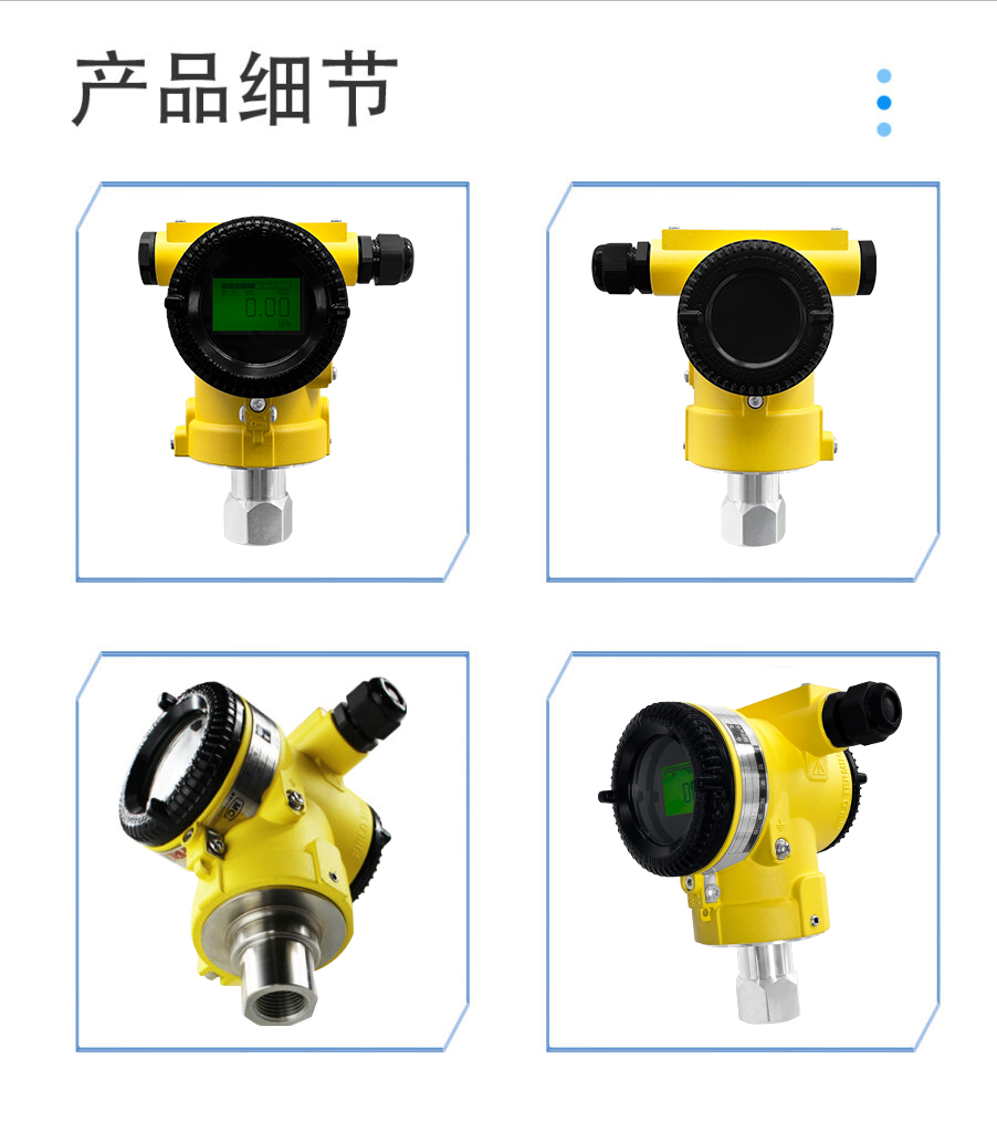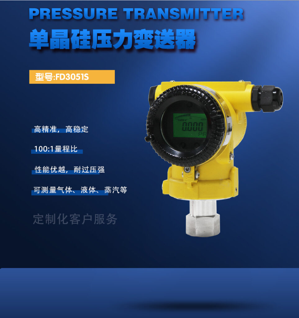 FD3051ST系列智能型单晶硅压力变送器是一款高精度、高稳定、多参数的压力测量产品,符合HART协议。该产品采用的数字技术是传感器制造领域的最新应用成果,结合国际先进的单晶硅芯体设计制造技术,进行精密数字化温度补偿和非线性修正。LCD4位半显示,标准信号输出,满足了的现场及控制室的各种观测。可靠的防爆结构设计和标准化的信号输出,精度高、量程覆盖范围宽,适用于需要对流体压力进行精密测量。可以HART375手操器进行数字通讯,电磁辐射符合IEC801标准。